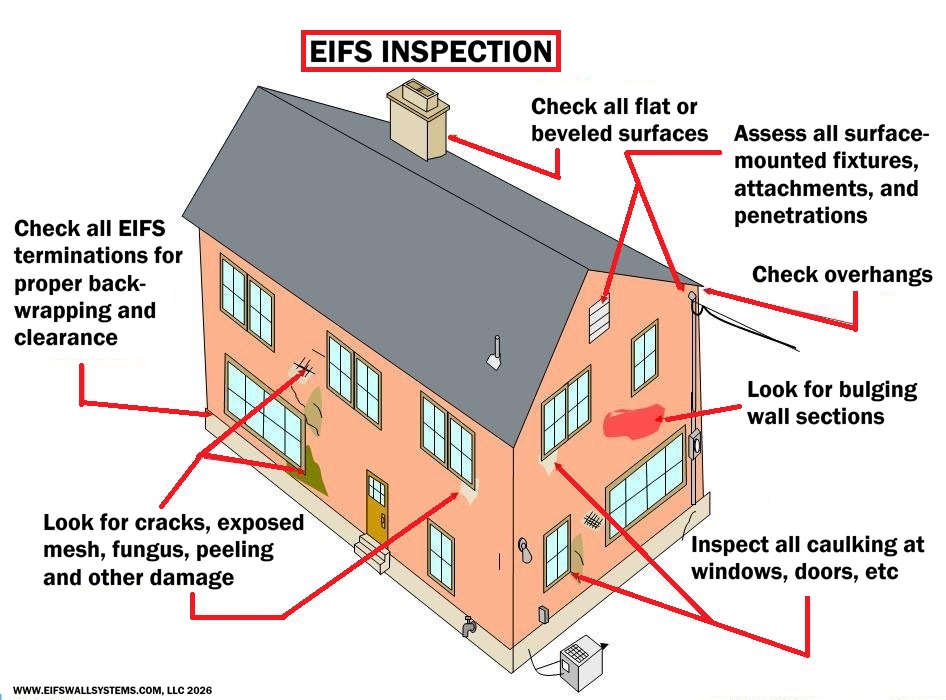 Proper clearance: EIFS should terminate ≥6 inches above grade/soil; check for bridging or contact with landscaping/grade.